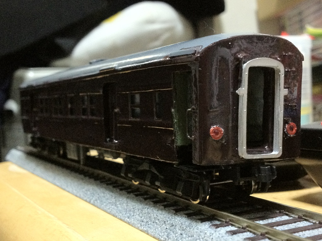 ガラスの取り付けに1日、乗降口の塗装、カプラー取り付けあと3日くらいで完成かな